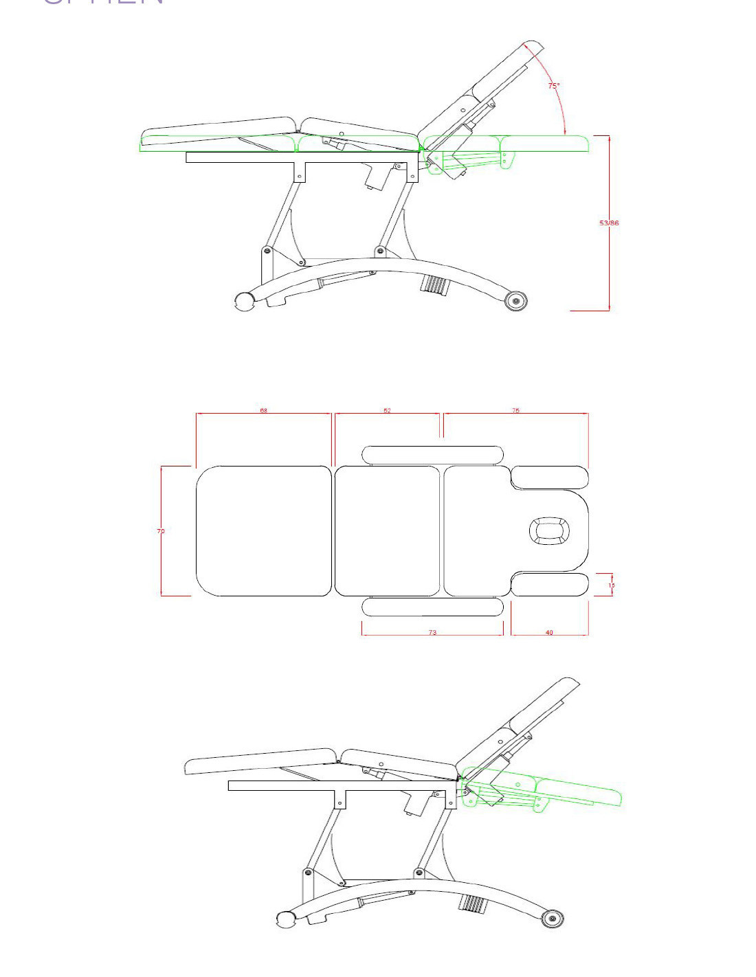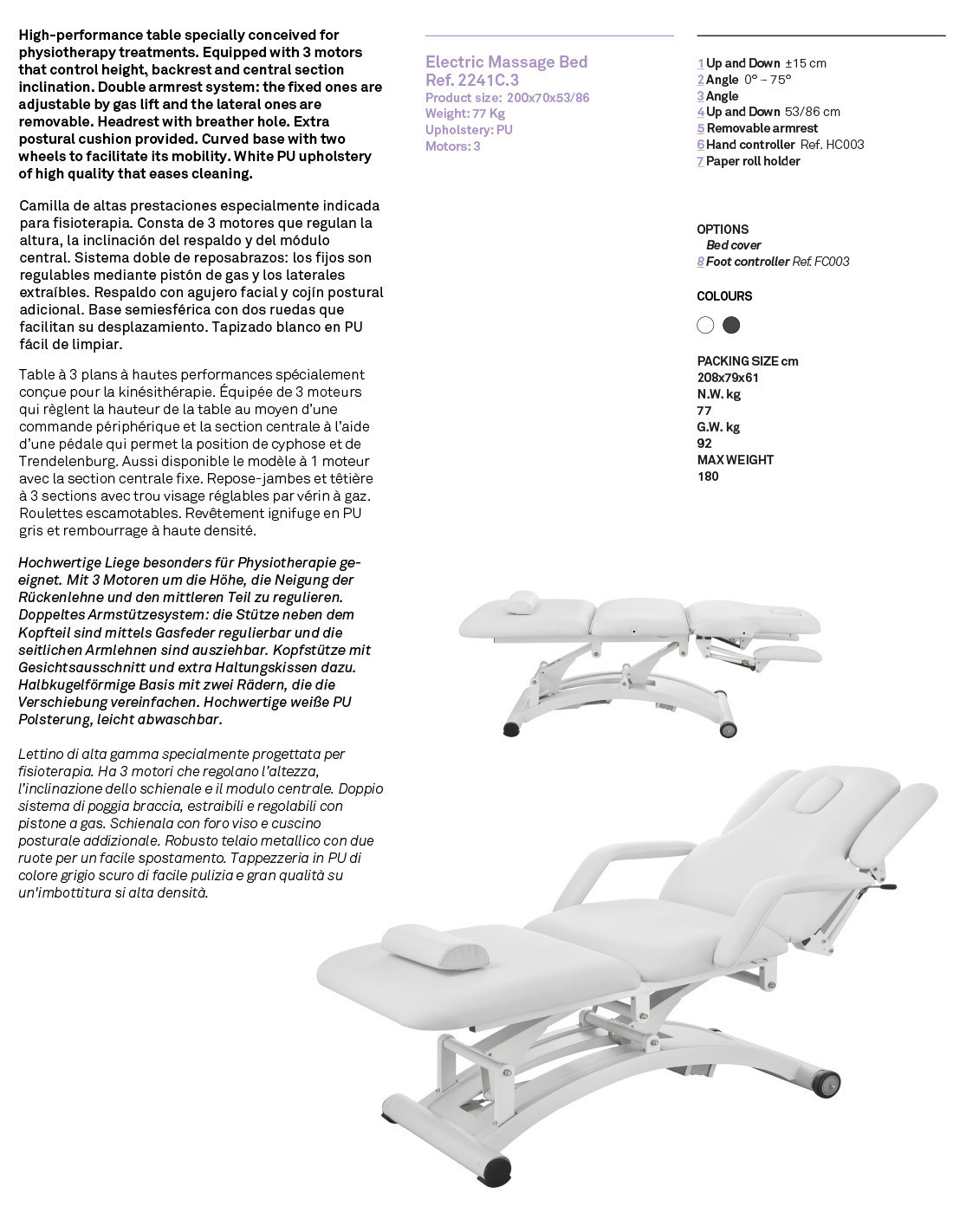 Carena lettino fisioterapia e massaggi di alta gamma, è dotato di 3 motori che regolano l’altezza, l’inclinazione dello schienale e il modulo centrale. Doppio sistema di braccioli: quelli fissi sono regolabili con un pistone a gas ed i laterali sono estraibili. Schienale con foro facciale e cuscino posturale addizionale. Robusto telaio metallico a forma di semisfera con due ruote per un facile spostamento. Rivestimento in PU facile da pulire e disponibile anche in grigio scuro.