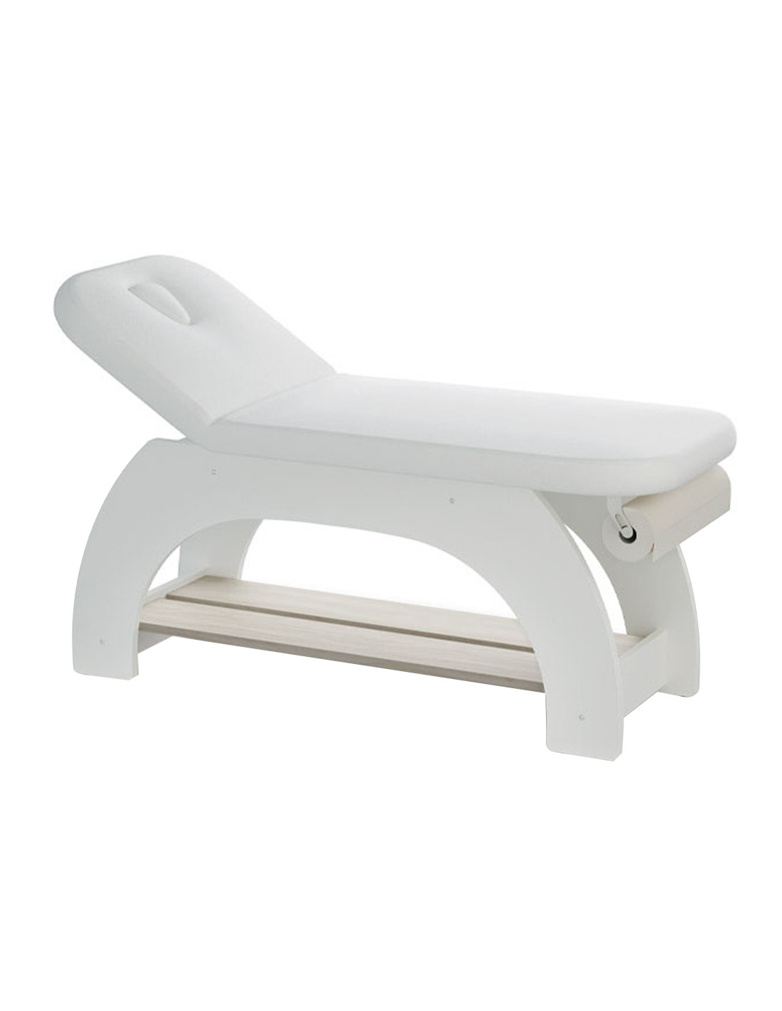 Il lettino Made è realizzato in nobilitato bianco opaco con piano d’appoggio disponibile in 3 diverse finiture. Il materasso in skai bianco è dotato di foro facciale, relativo tappo e portarotolo per garantire il massimo comfort. La testata e lo schienale sono regolabili manualmente consentendo di adattare il lettino alle esigenze specifiche di ogni cliente.