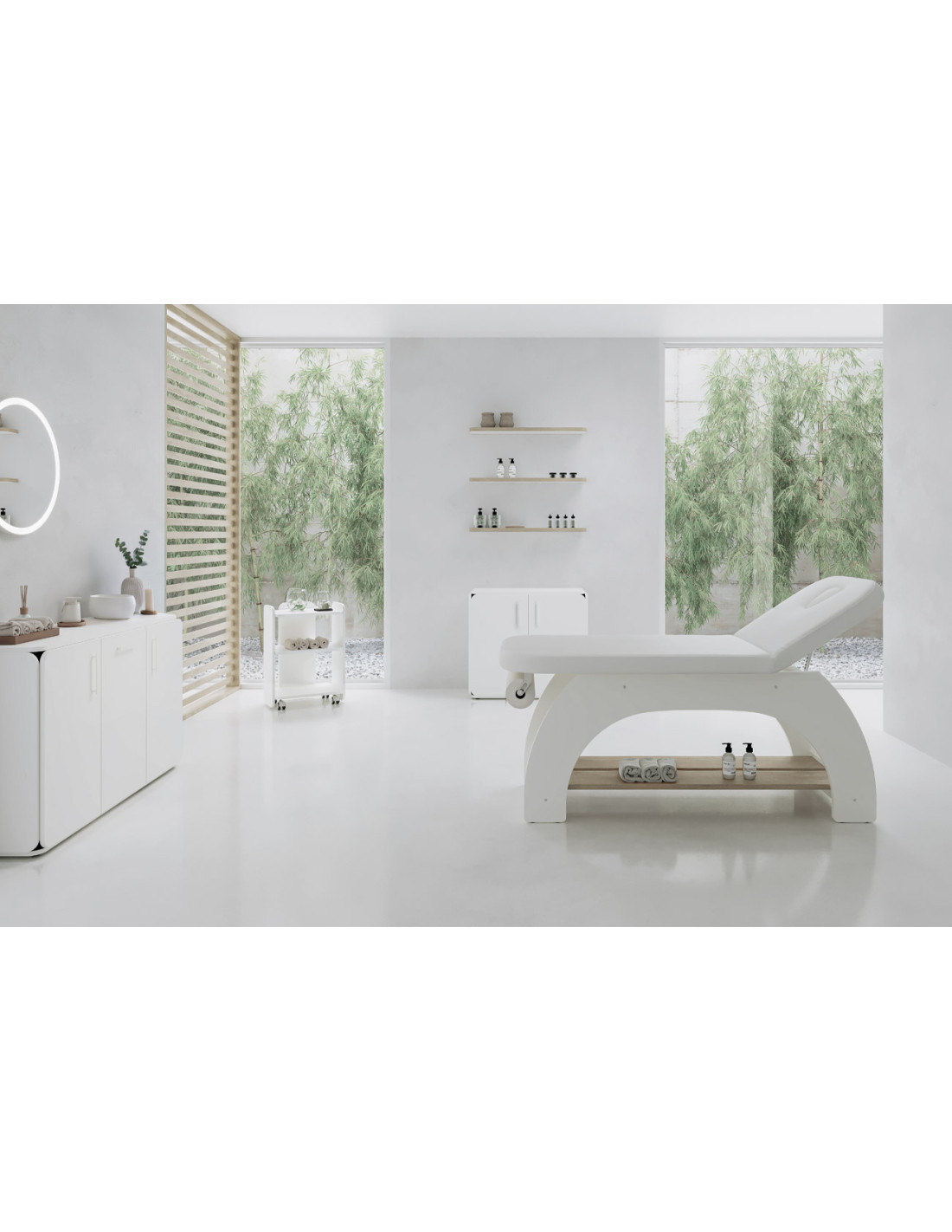 Il lettino Made è realizzato in nobilitato bianco opaco con piano d’appoggio disponibile in 3 diverse finiture. Il materasso in skai bianco è dotato di foro facciale, relativo tappo e portarotolo per garantire il massimo comfort. La testata e lo schienale sono regolabili manualmente consentendo di adattare il lettino alle esigenze specifiche di ogni cliente.