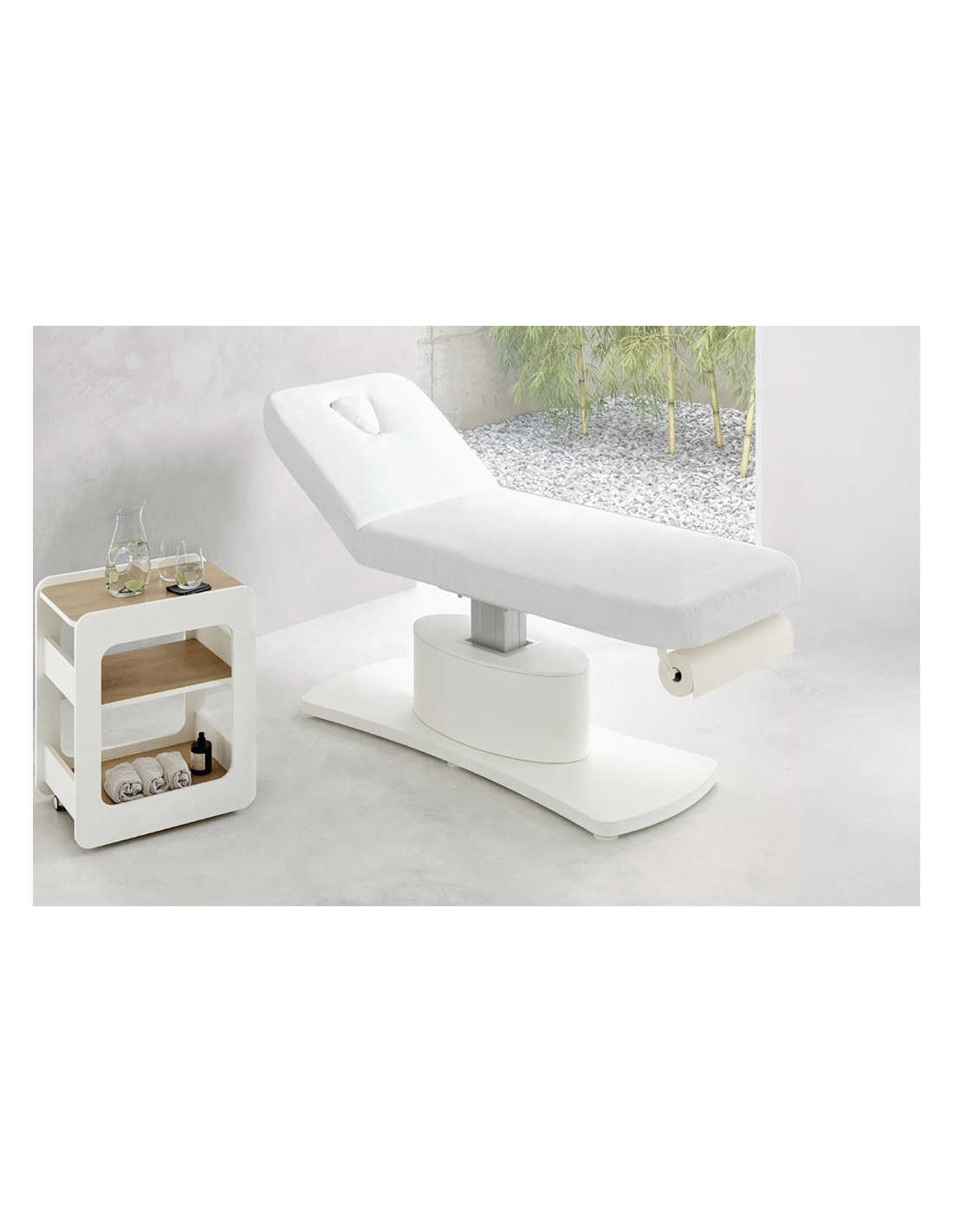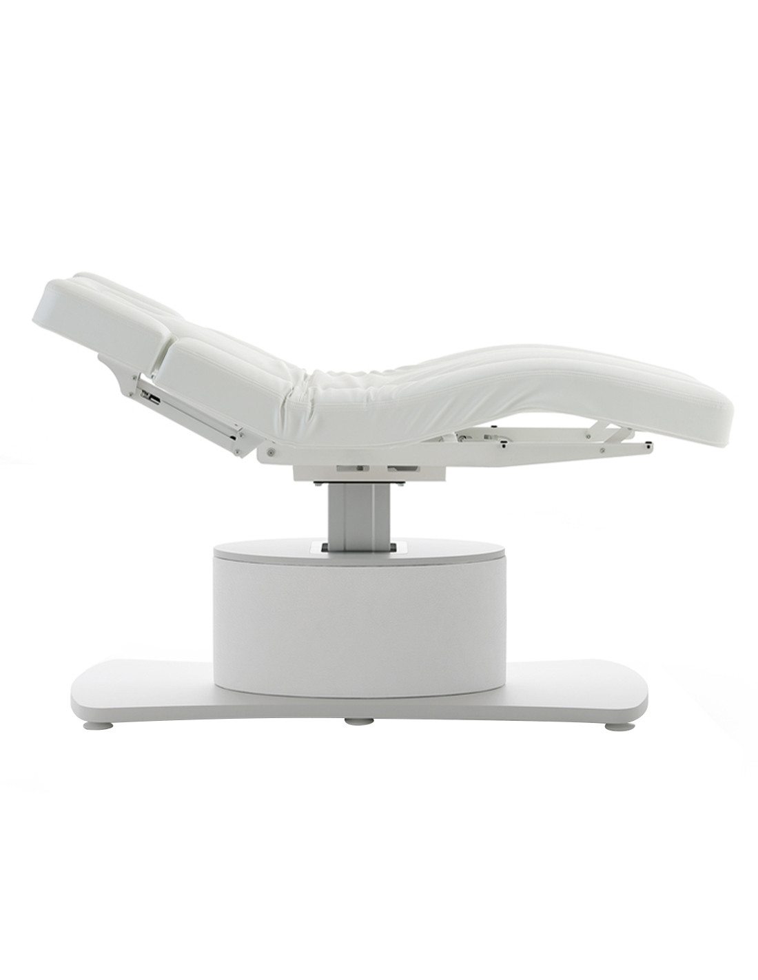 Salva le personalizzazioni per aggiungerle al catalogoLettino a 2 motori mono-colonna, con materasso mover in skai bianco dotato di foro facciale con relativo tappo e porta rotolo. La regolazione dell’altezza e dello schienale avviene tramite telecomando. Il basamento è bianco opaco e l’ovale può essere rivestito in skai disponibile in 14 colori.