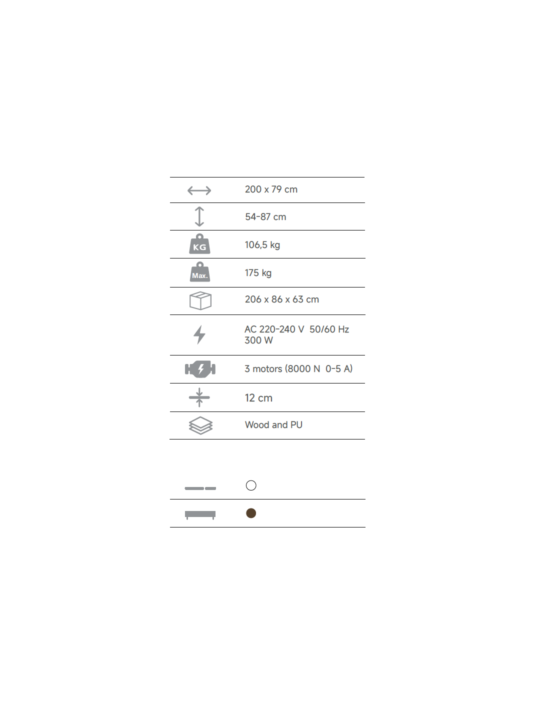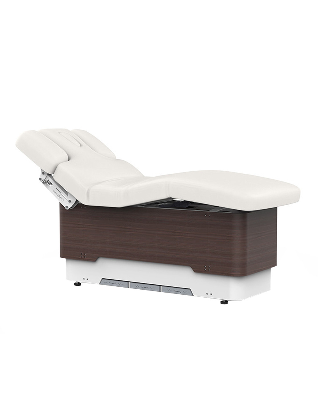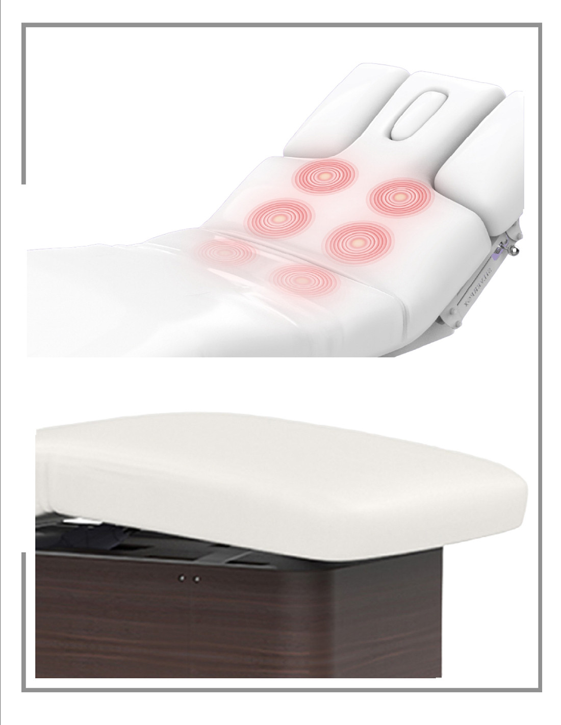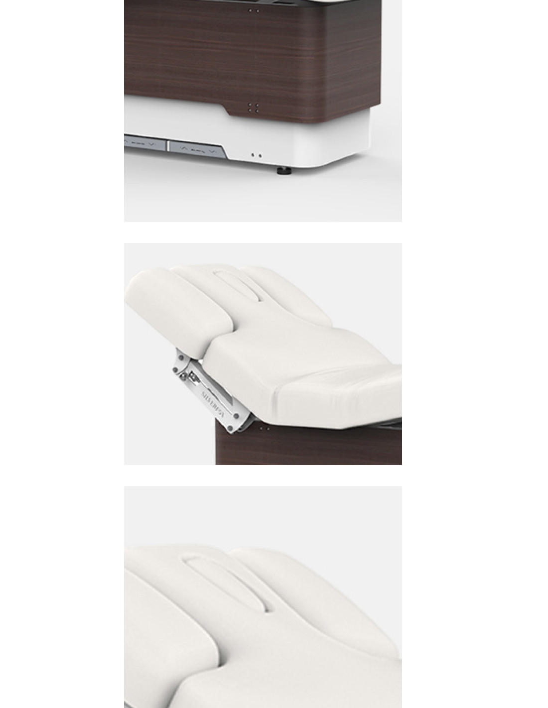 Dotato di 3 motori per la regolazione dell’altezza, l’inclinazione dello schienale e l’angolazione del supporto gambe tramite pedaliera Integrata nella base. Sistema di riscaldamento integrato con temperatura regolabile che assicura al cliente un calore piacevole e costante. Struttura solida e rivestimento del lettino in ecopelle di alta qualità.