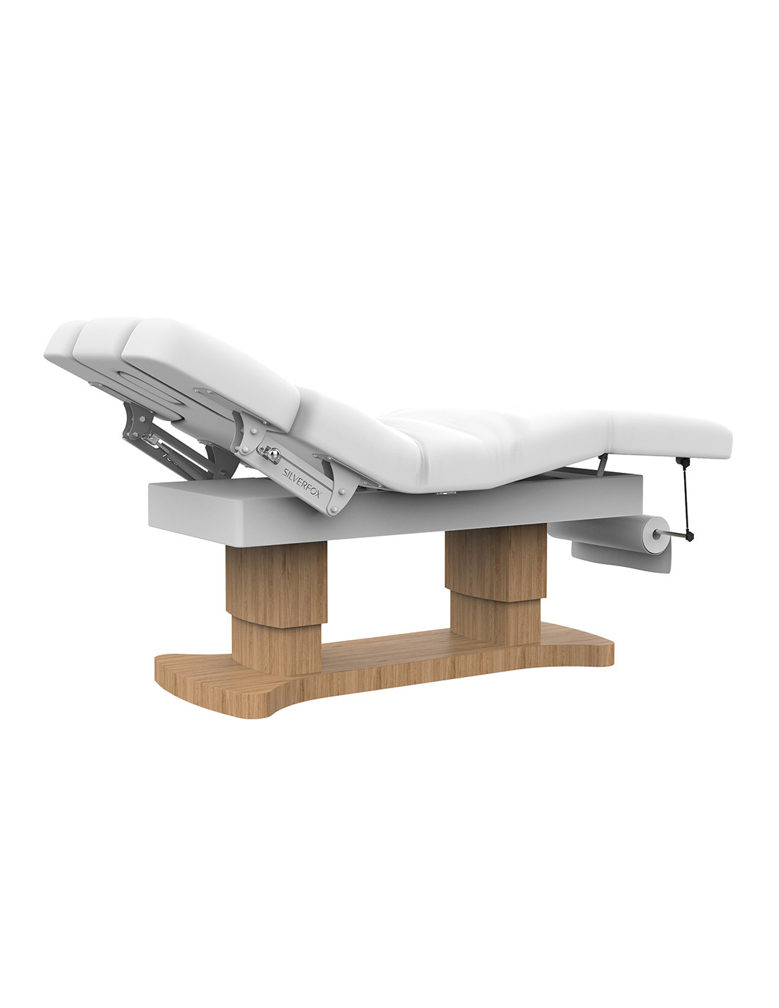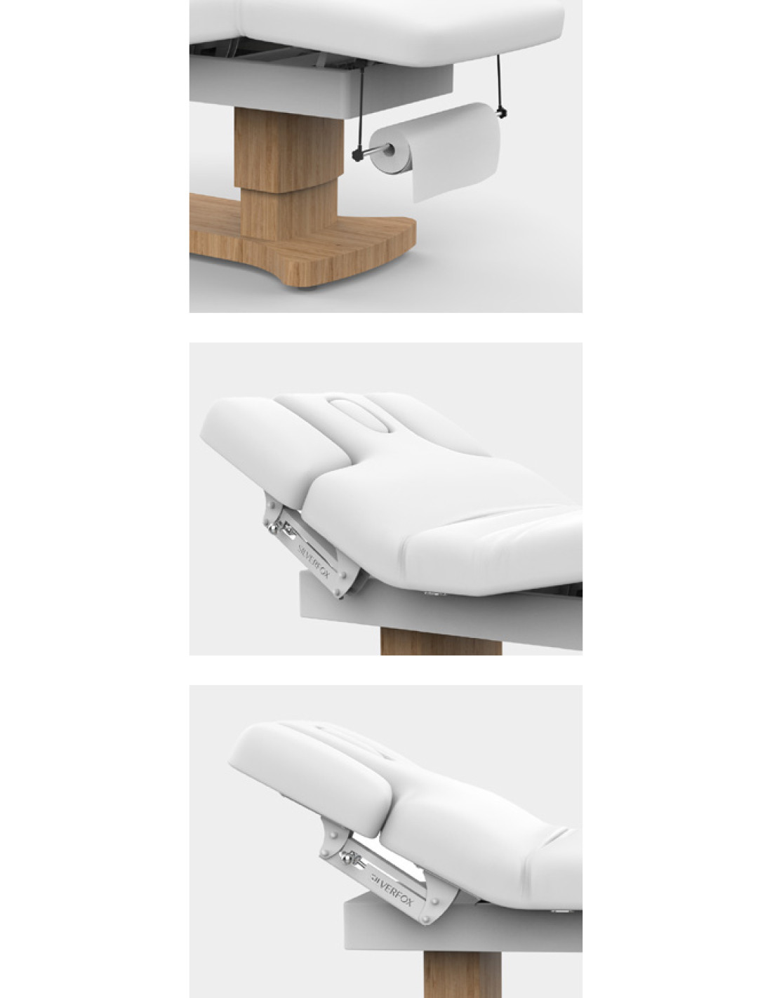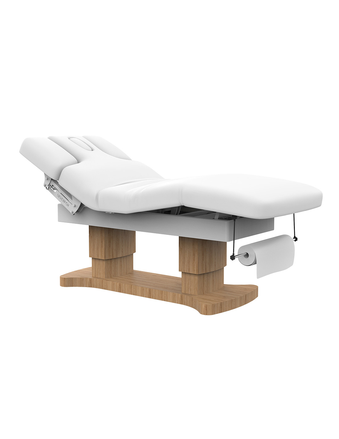 Lettino a 4 motori per la regolazione di altezza, l’inclinazione dello schienale, del poggiapiedi e la posizione della seduta. Dotato di un sistema di riscaldamento che garantisce un comfort termico ottimale. Foro per il viso e pratico portarotolo integrato. Rivestimento in Ecopelle premium facile da pulire. Il materasso è imbottito con un’alta densità di schiuma, la struttura è robusta e durevole, studiata per resistere a un uso intenso nel tempo.