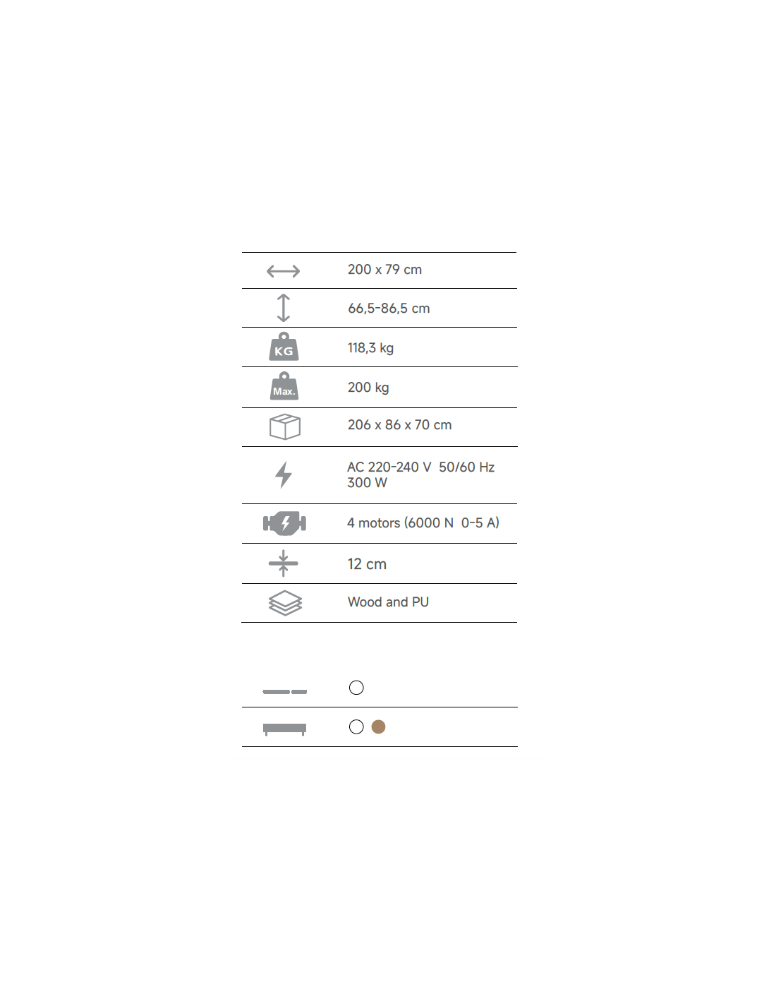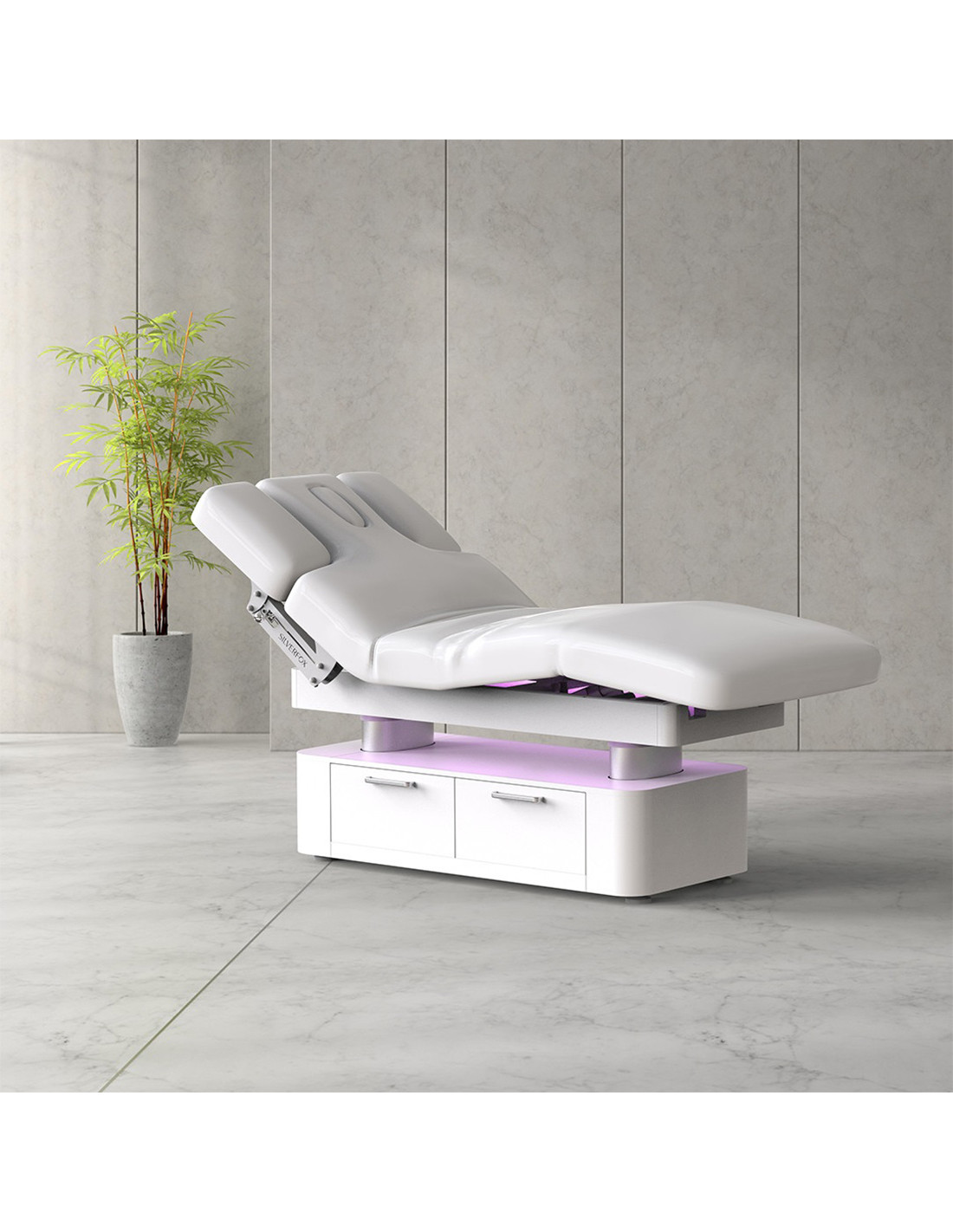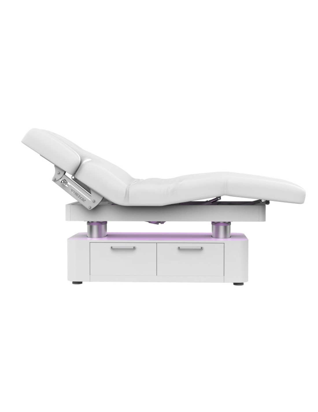 Lettino 4 motori e doppia colonna, rivestito con un’imbottitura morbida e confortevole facile da pulire. Dotato di due pratici armadietti, ideali per riporre strumenti e accessori. Offre una funzione di ripristino automatico con un solo tocco permettendo di riportare il lettino alla posizione iniziale. Marte è in grado di raggiungere una posizione quasi a gravità zero, ideale per offrire un relax profondo durante i trattamenti. Braccioli, poggiatesta (con fori di ventilazione) e poggiapiedi regolabili. Illuminazione LED e funzione di riscaldamento integrata.