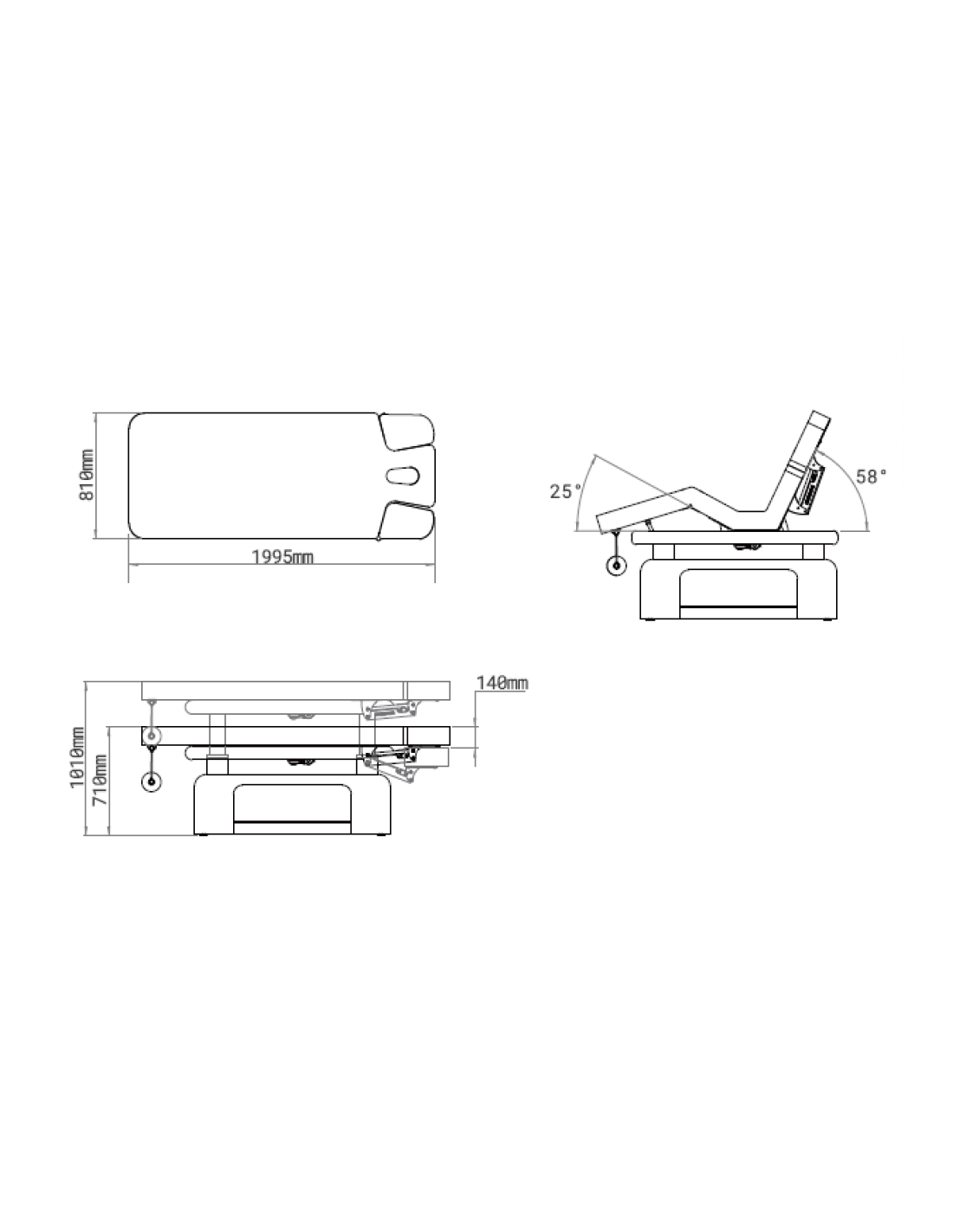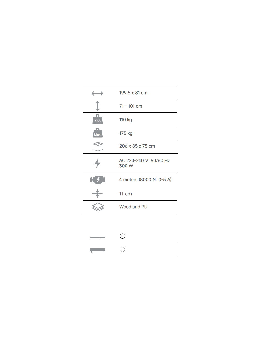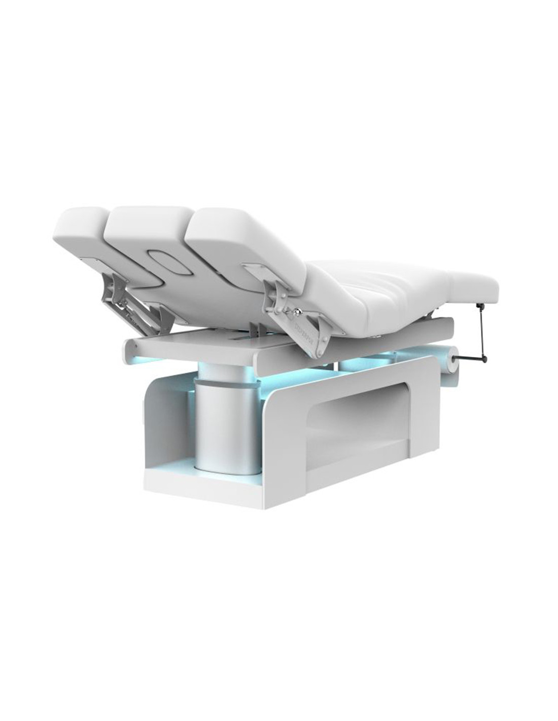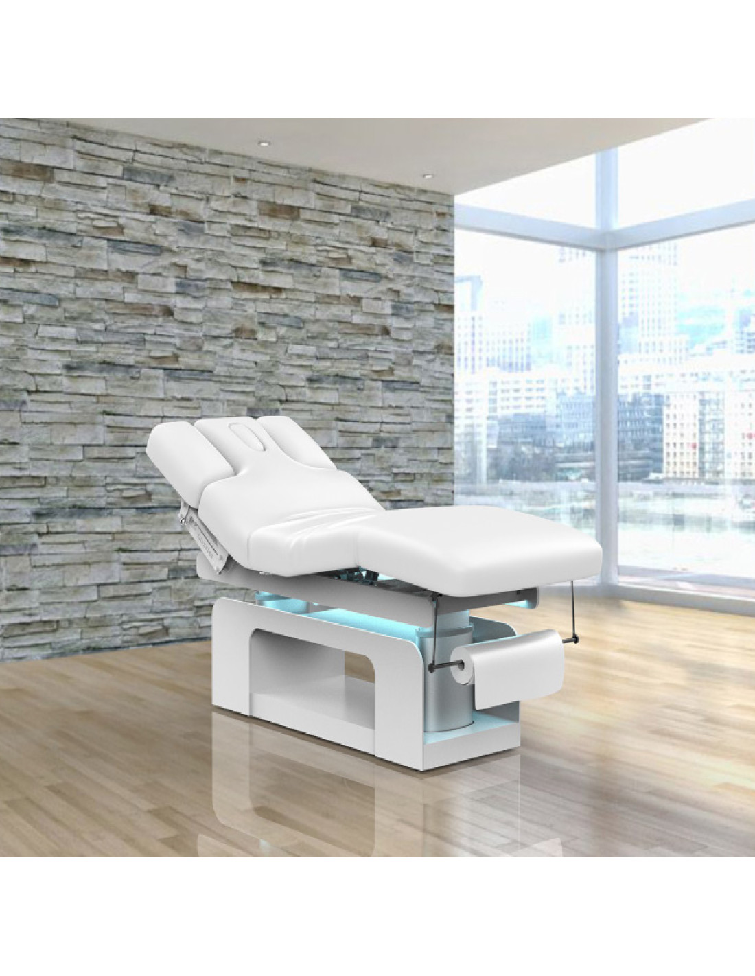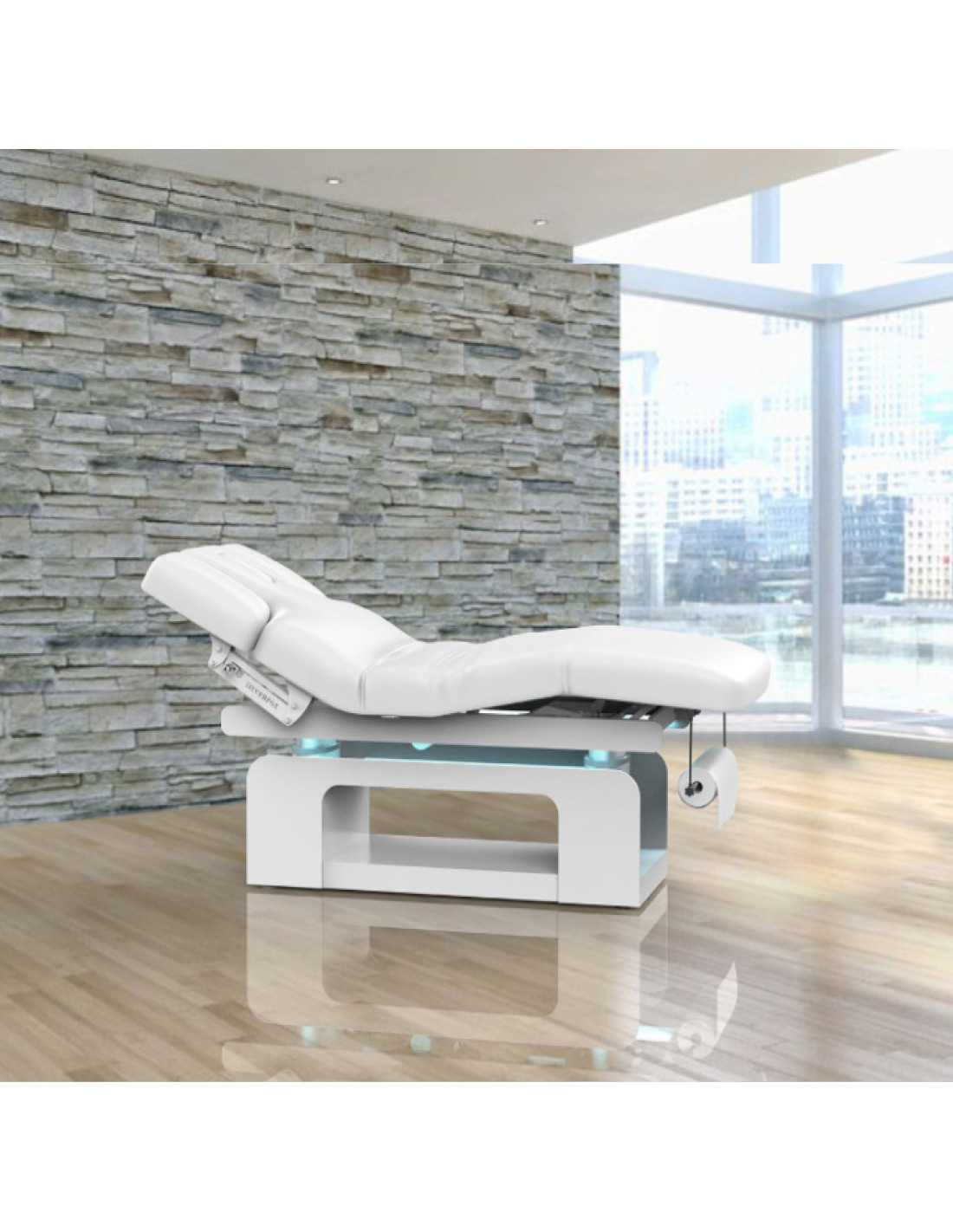 Lettino a 4 motori per la regolazione dell’altezza, l’inclinazione dello schienale, il supporto gambe e l’angolazione complessiva del lettino. Materasso con riscaldamento Integrato in ecopelle di alta qualità, nel colore bianco. La base del lettino, di colore grigio, dona un tocco di eleganza. Il contrasto tra la base grigia e il materasso bianco crea un’estetica sofisticata e accogliente.