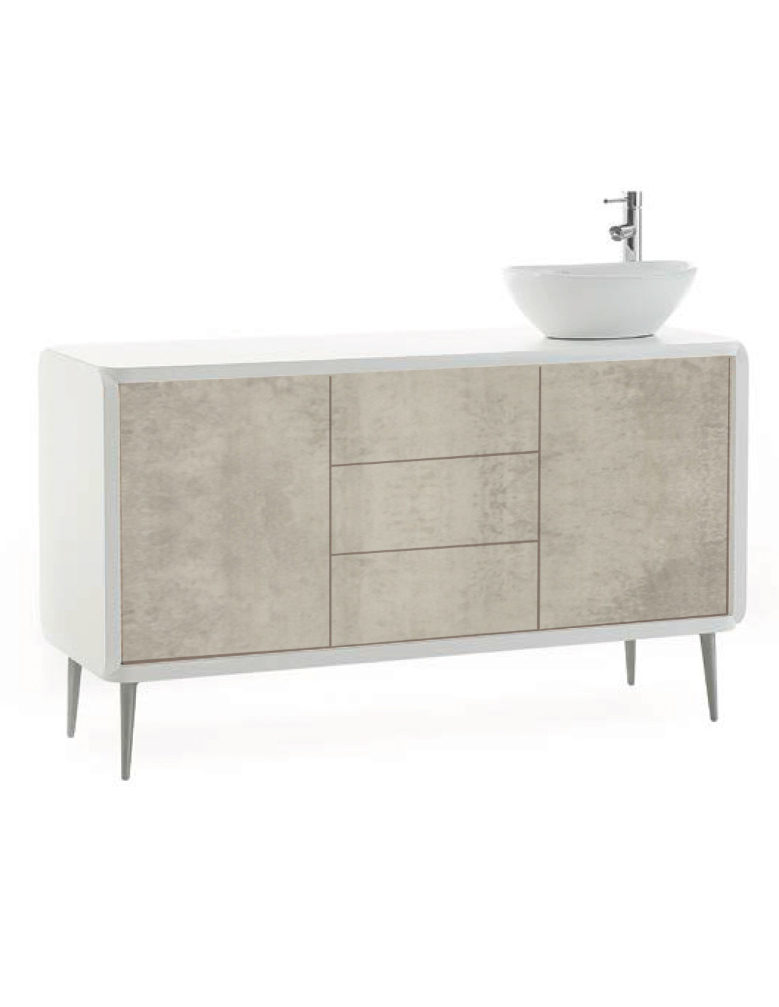 Il mobile Creo 1350 H2O è realizzato in legno Nobilitato bianco opaco e frontali disponibili in 8 diverse finiture ha linee semplici ma moderne e arreda, con originalità e stile, ogni ambiente. I piedini in alluminio satinato e l’apertura push/pull delle ante e dei cassetti assicurano praticità e raffinatezza. Dotato di due ante con ripiani, tre cassetti con guida a scomparsa con self-closing, chiusura ammortizzata, top in laminato, apertura push/pull, lavabo e miscelatore.