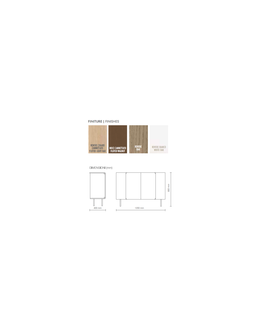 Mobile di servizio con struttura in legno liscio (rovere chiaro o rovere sbiancato) o cannettato (rovere chiaro o noce) e ante bianche. Design minimalista arricchito da angoli arrotondati e piedini sottili in metallo verniciati in RAL 1035. Ampio piano di appoggio e spazio contenitivo con ante che offre funzionalità e stile. Top in vetro pure white e profilo in nikel antigraffio.